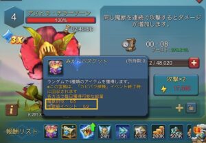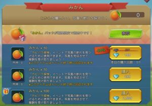 毎日獲得できるみかんバスケットは魔獣討伐で5個、地獄級イベントで2個と少なめ。