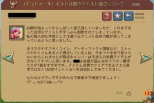 ですが、ギルドのランクに合わせた共闘をすることが難しいアカウントを置いておくことはギルド全体の士気に関わる問題に発展しかねない、と思いましたので該当するアカウントはイベント終了後に脱退の措置を取ることに決めました。