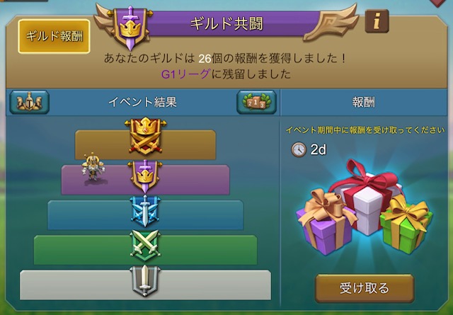 今朝は早起きしていたためお昼前くらいにウトウトしてしまい目が覚めたのはギルド共闘が終了する30分前。私が持っている3アカウント中1つのアカウントがまだクエスト完了報告を保留していたため早く報告しなきゃと思い、現在のギルド順位を確認するためロードモバイルを開きました。